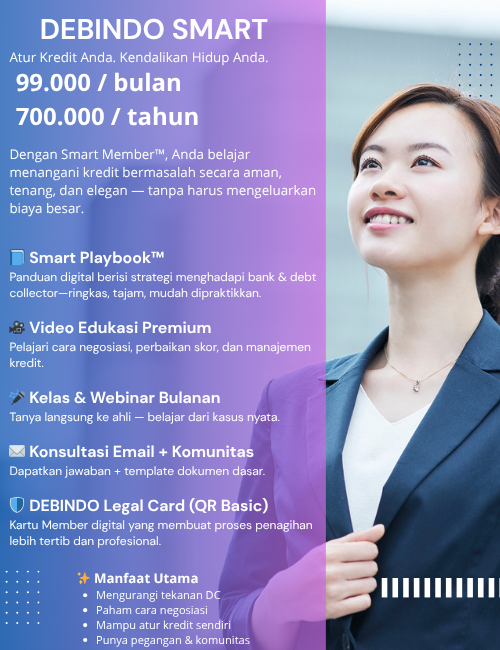 DEBINDO Smart™ adalah platform edukasi digital berbasis konten terstruktur yang dirancang untuk membantu masyarakat memahami prosedur pengelolaan pinjaman, hak sebagai konsumen finansial, serta strategi komunikasi yang tepat dalam menghadapi proses penagihan.